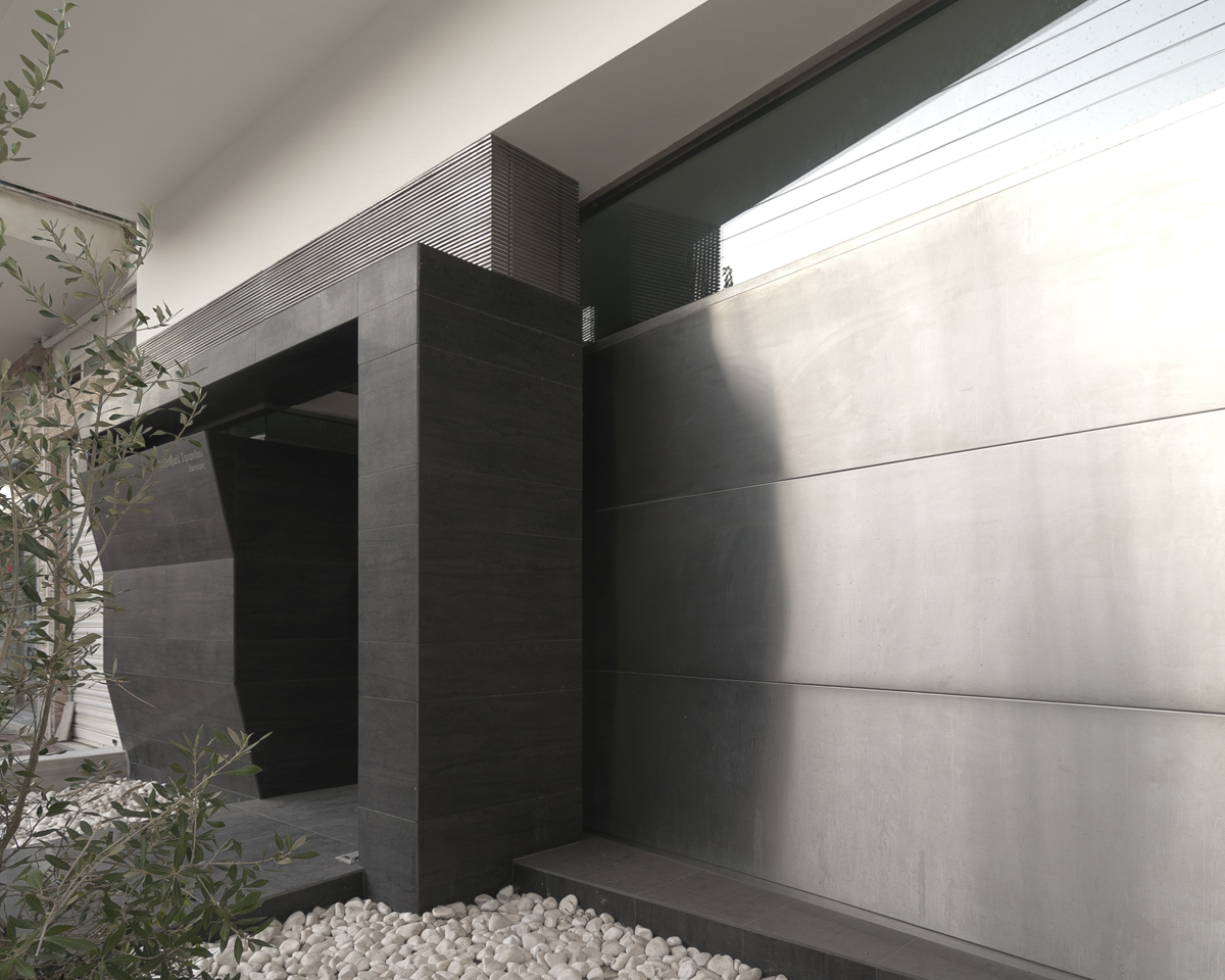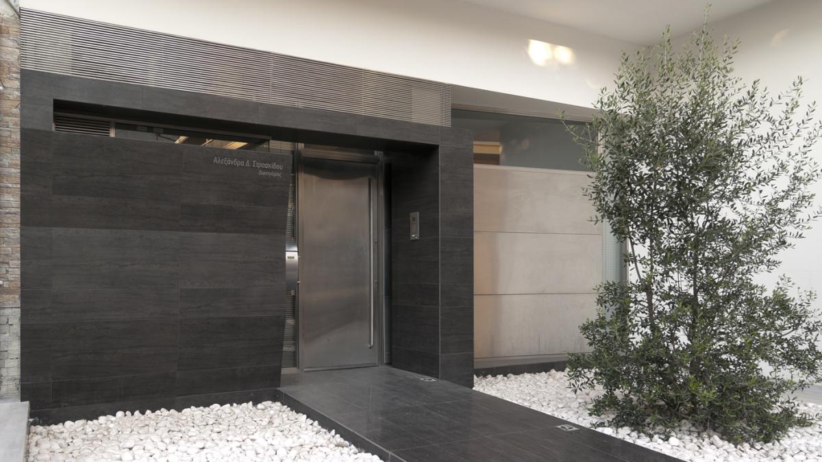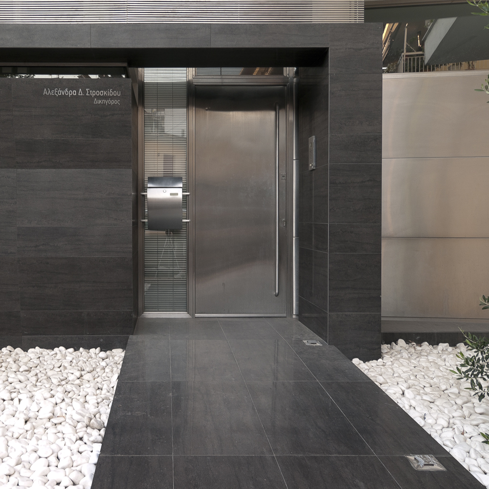 Η εξωτερική διαμόρφωση και ο επικλινής διάδρομος προσέγγισης, διαχωρίζουν το γραφείο από το πεζοδρόμιο και αναδεικνύουν την είσοδό του.