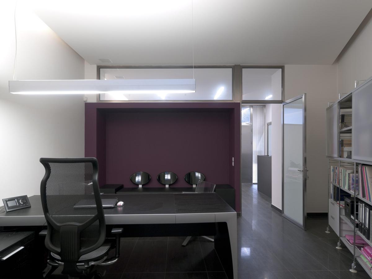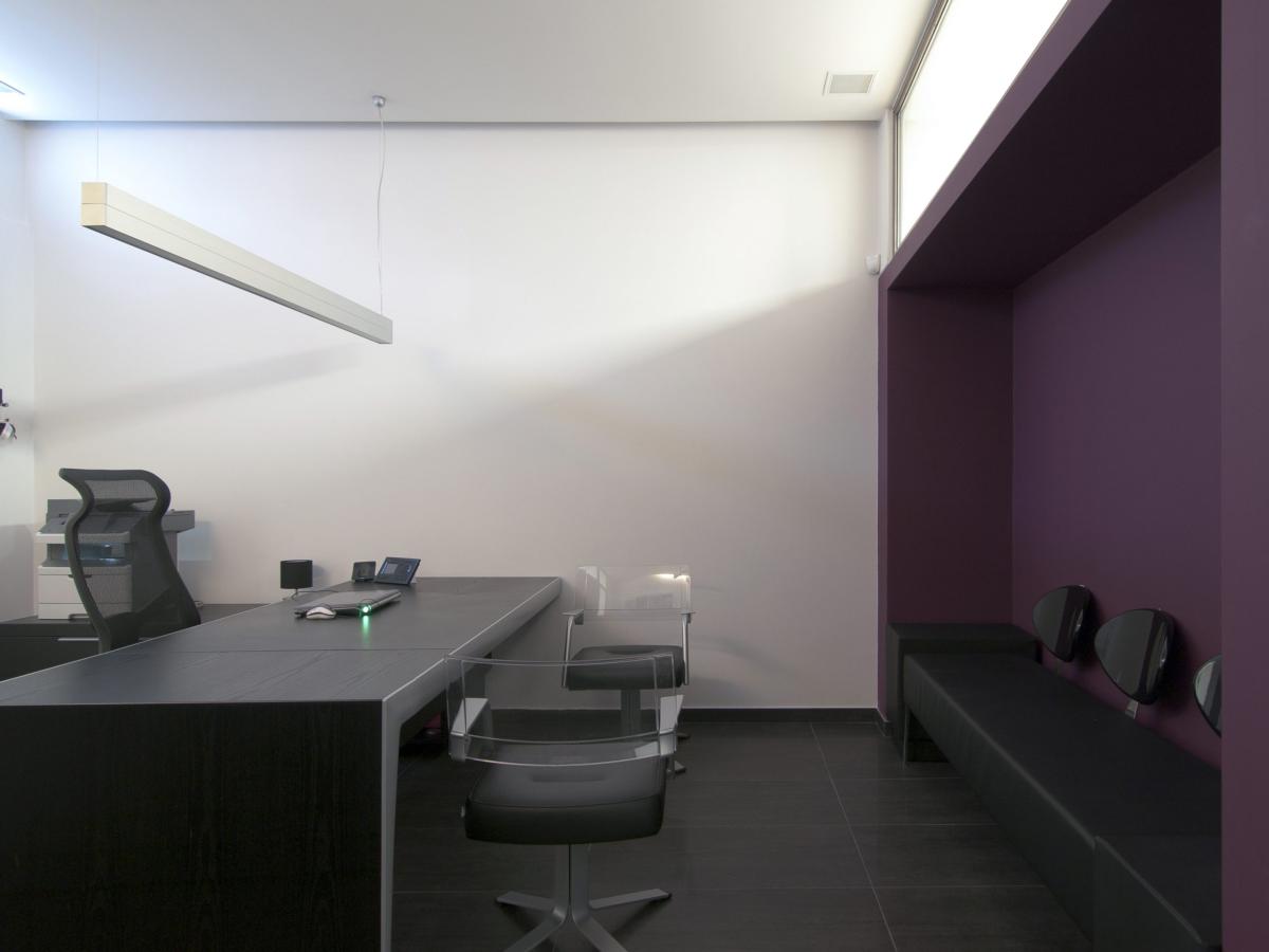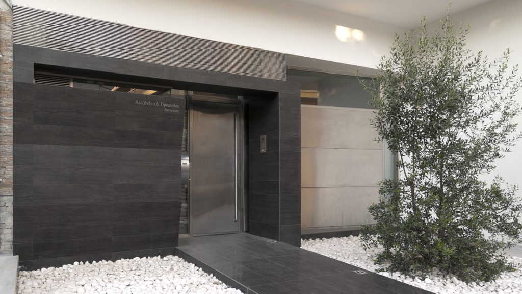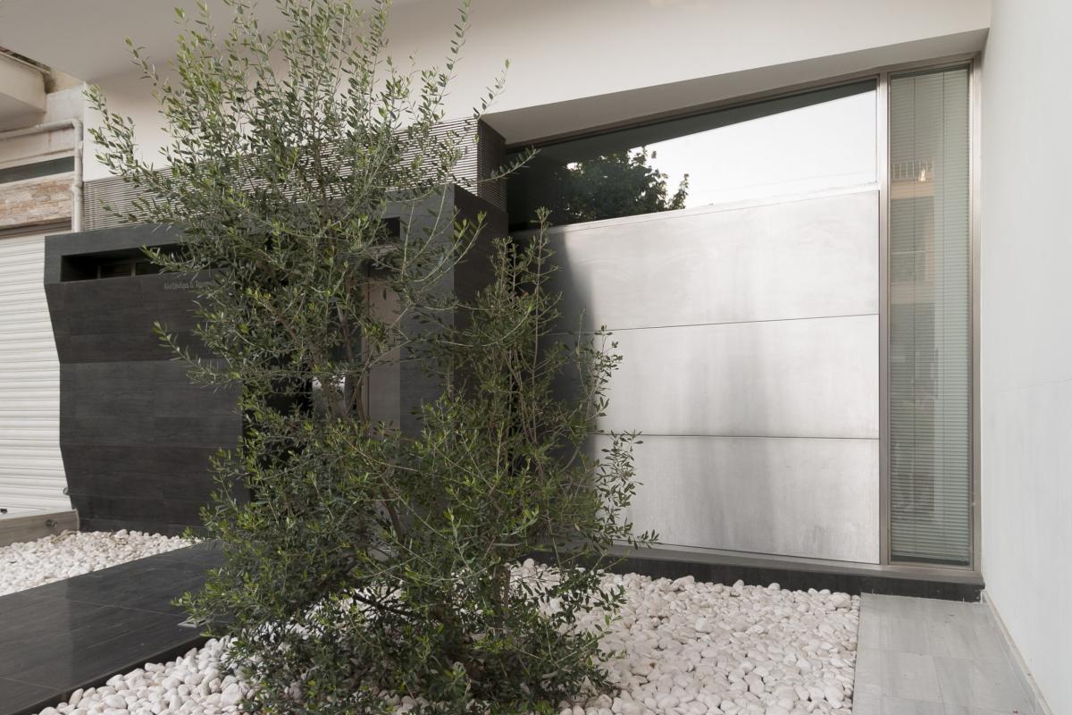 Η εξωτερική διαμόρφωση και ο επικλινής διάδρομος προσέγγισης, διαχωρίζουν το γραφείο από το πεζοδρόμιο και αναδεικνύουν την είσοδό του.