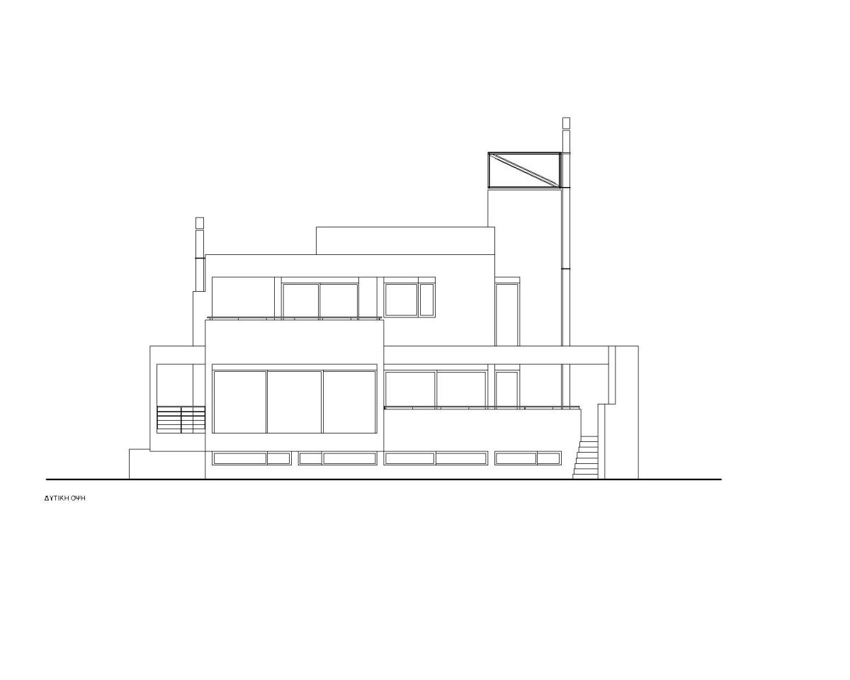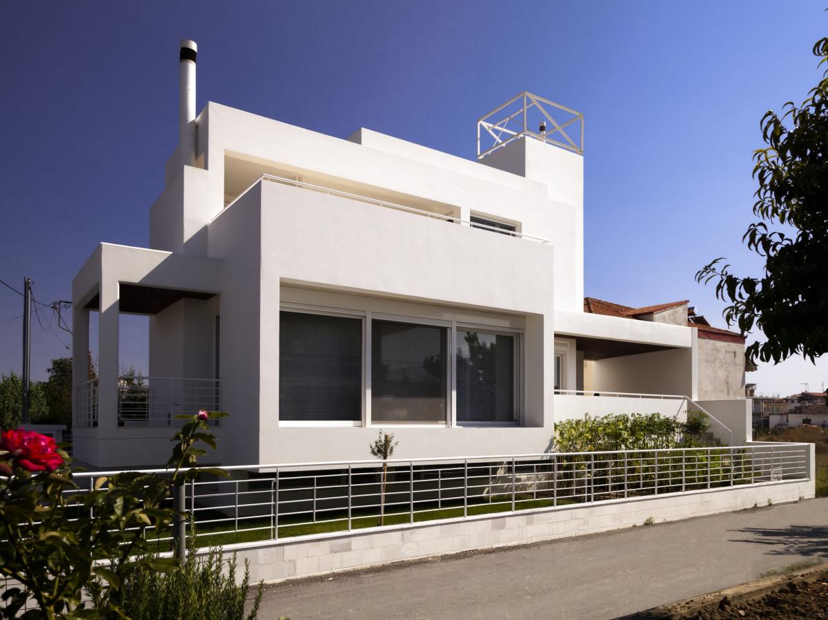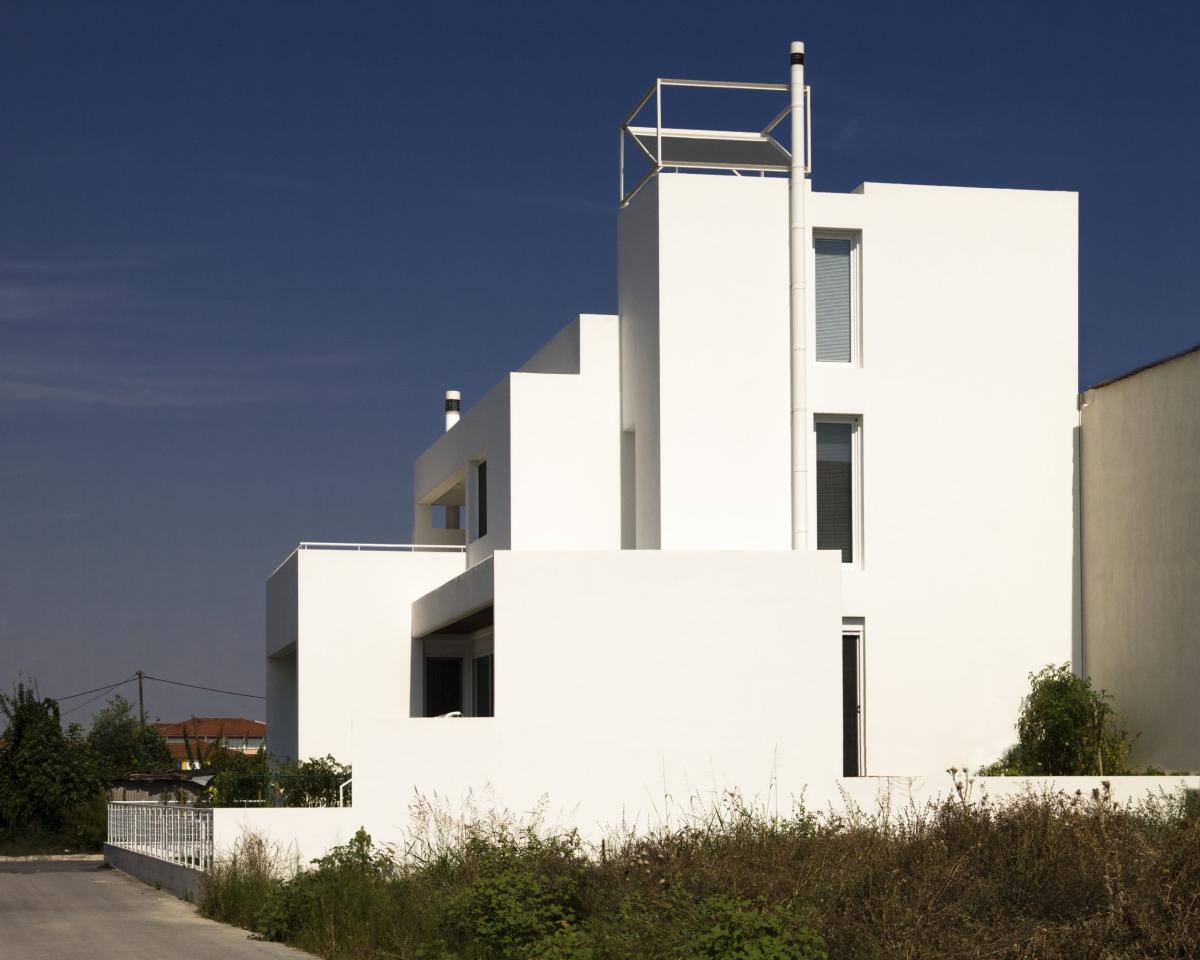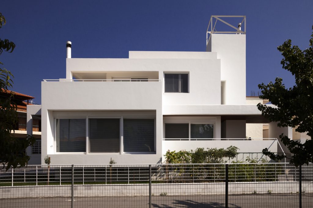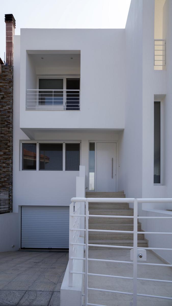 Μία σύνθεση όγκων που εκφράζουν εξωτερικά την λειτουργική δομή της κατοικίας, αναπτύσσονται από το ισόγειο, υποχωρούν στον όροφο των υπνοδωματίων και καταλήγουν στον πυρήνα – πύργο της σύνθεσης, το κλιμακοστάσιο της κατοικίας.