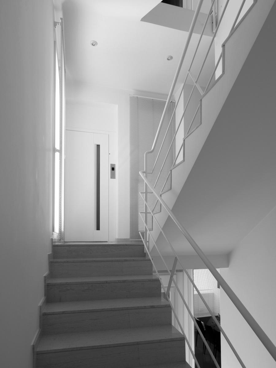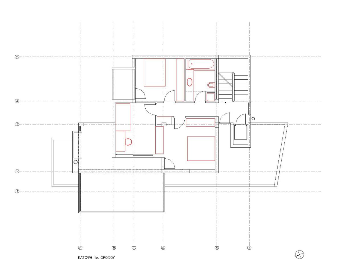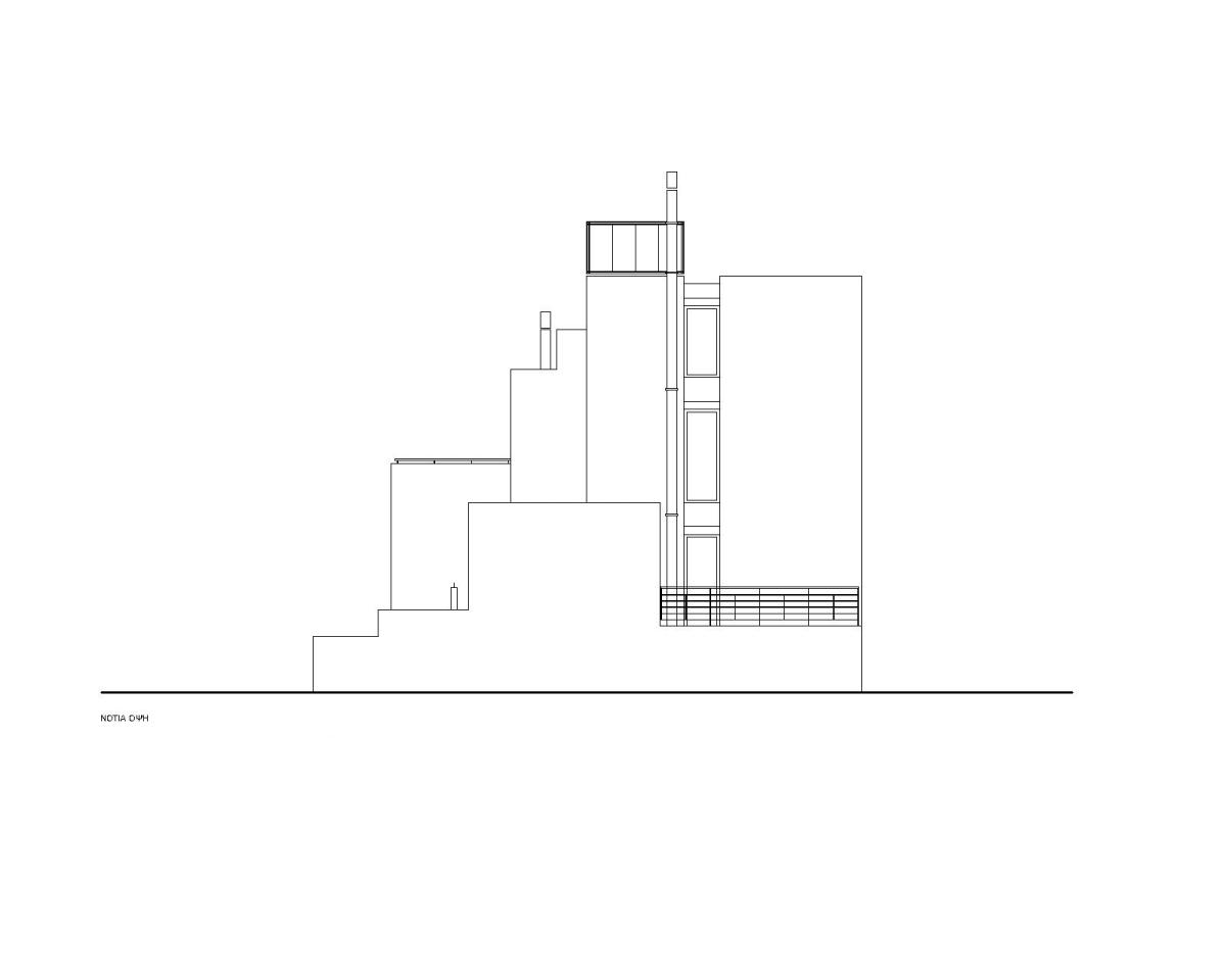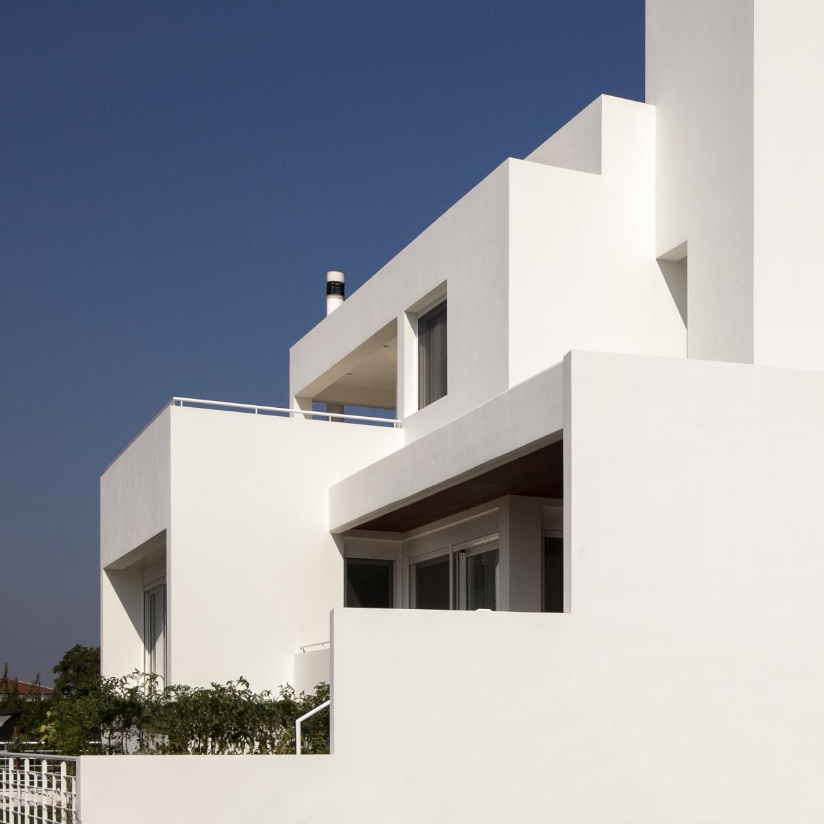 Μία σύνθεση όγκων που εκφράζουν εξωτερικά την λειτουργική δομή της κατοικίας, αναπτύσσονται από το ισόγειο, υποχωρούν στον όροφο των υπνοδωματίων και καταλήγουν στον πυρήνα – πύργο της σύνθεσης, το κλιμακοστάσιο της κατοικίας.