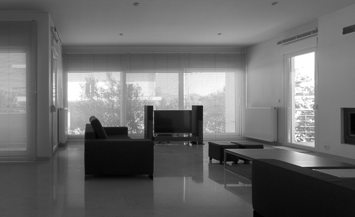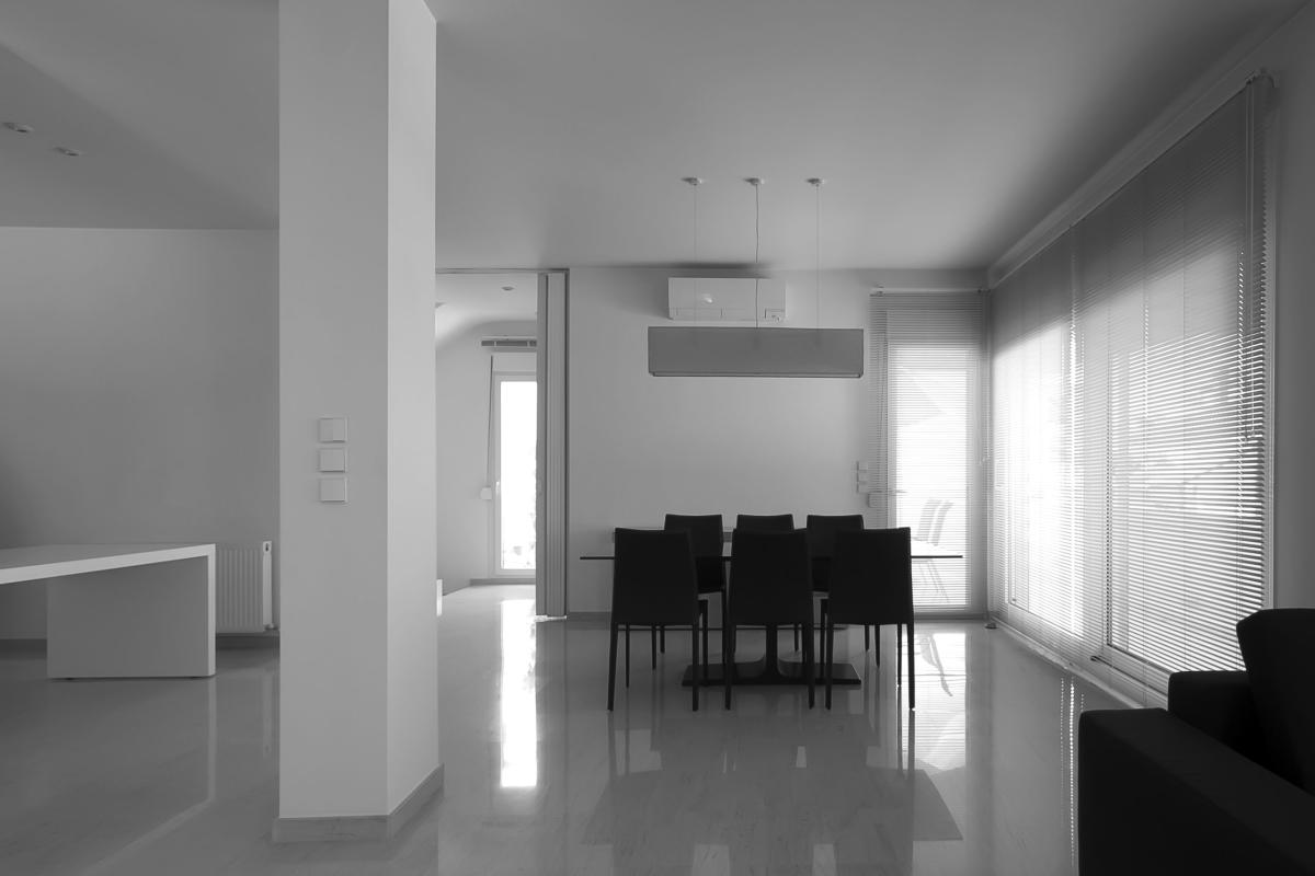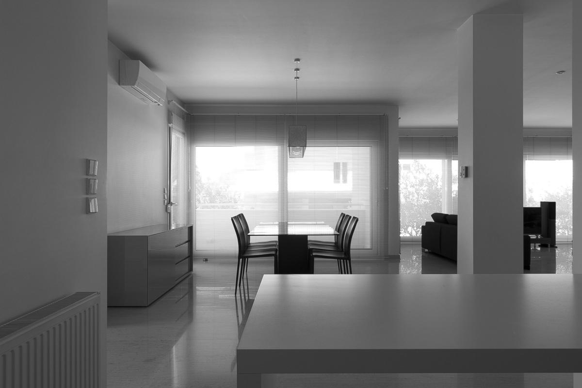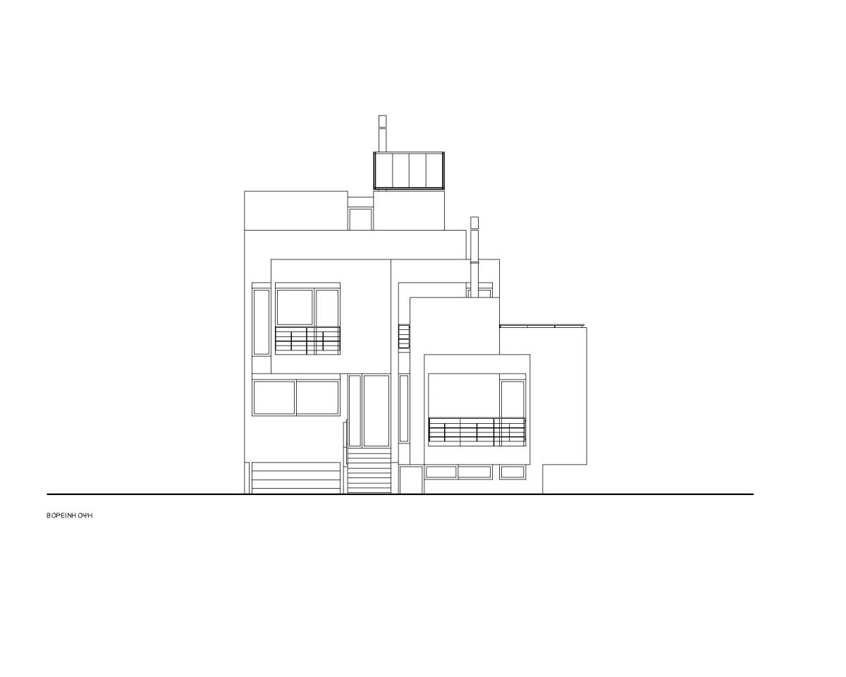 Η ύπαρξη ελάχιστων ανοιγμάτων στην βόρεια πλευρά της κατοικίας την προστατεύουν από οχλήσεις του δρόμου. Μεγάλα ανοίγματα νοτιοδυτικά σε ήσυχο δρόμο επιτρέπουν την είσοδο φωτός στην κατοικία και τη θέα στον Όλυμπο.