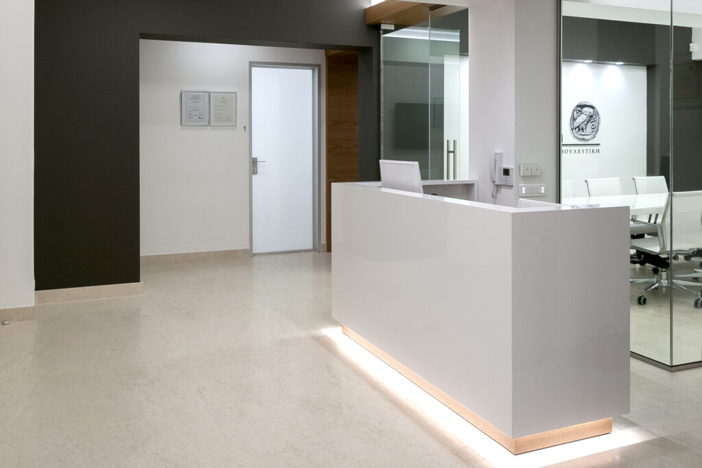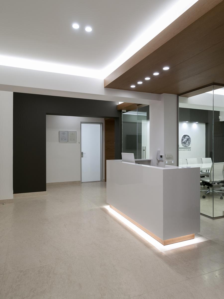 Η γυάλινη αίθουσα συνεδριάσεων γίνεται ο πυρήνας της οργάνωσης των γραφείων, επιτρέποντας ταυτόχρονα την είσοδο του φυσικού φωτός στον χώρο υποδοχής.