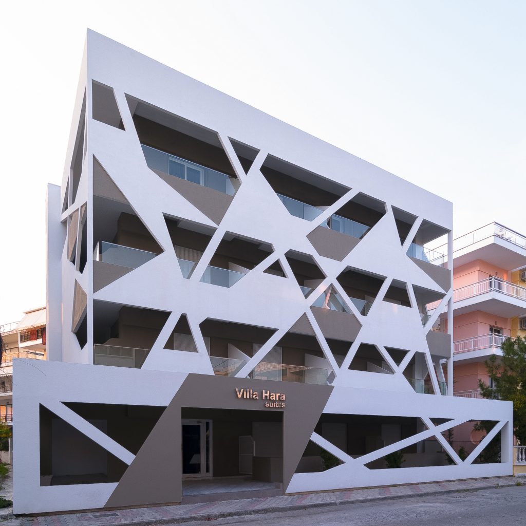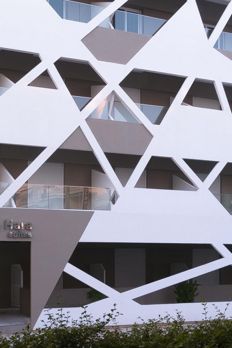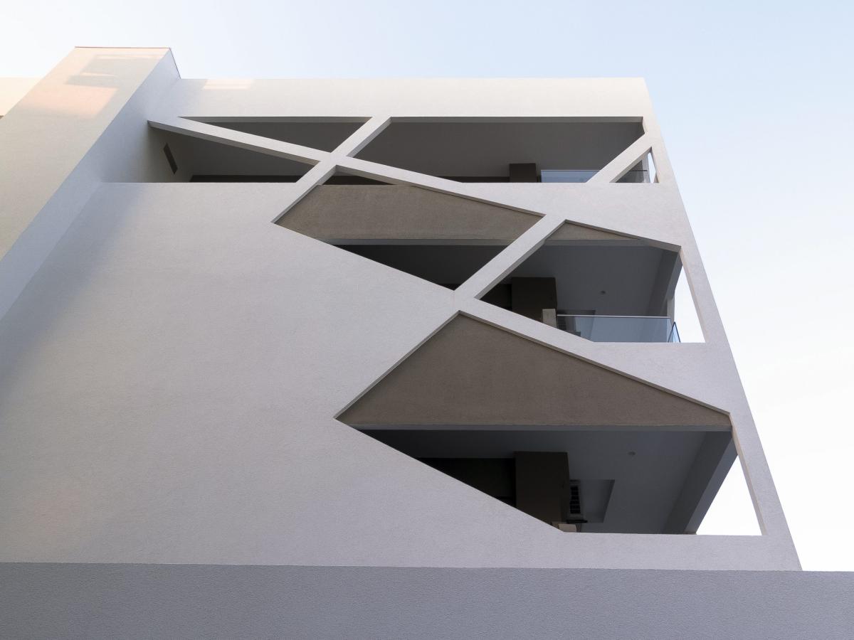 Ένας μανδύας, προσεκτικά υπολογισμένων διαγώνιων, ασύμμετρων ευθειών και τριγωνικών επιφανειών καλύπτει το κτίριο εξωτερικά, ακριβώς μπροστά από τους εξώστες, τούς σκιάζει, αφήνει την υπάρχουσα όψη σε δεύτερο πλάνο και το προβάλλει διαφοροποιώντας το από τις επικρατούσες οριζόντιες και κάθετες γραμμές των όψεων των κτιρίων της περιοχής.