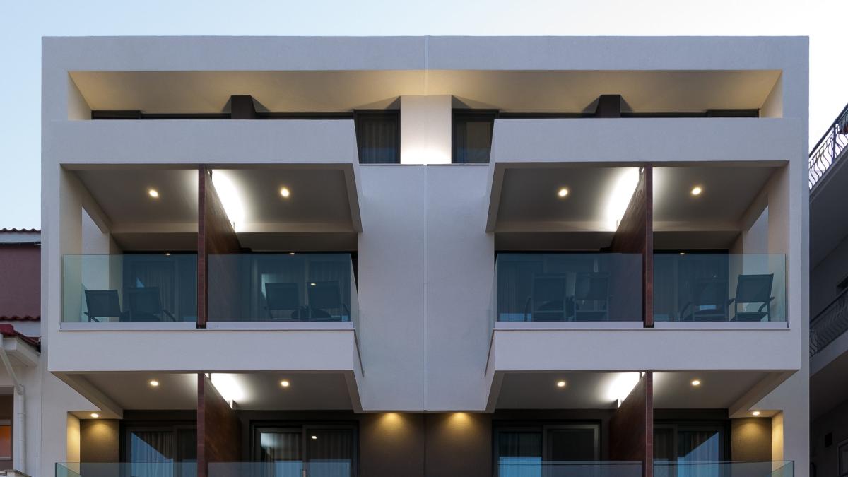 Η απαίτηση των ιδιοκτητών για κατασκευή δύο όμοιων κτιριακών μονάδων, που θα μπορούν να λειτουργούν ανεξάρτητα αλλά ταυτόχρονα και ως ένα κατάλυμα, σε συνδυασμό με το μικρότερο των 11 μέτρων πλάτος του οικοπέδου (5,5μ πλάτος κτιρίου για κάθε μονάδα), ήταν πρόκληση και καθοριστικός παράγοντας στην εύρεση της αρχιτεκτονικής μορφής και λειτουργικής οργάνωσης των δύο κτιρίων.