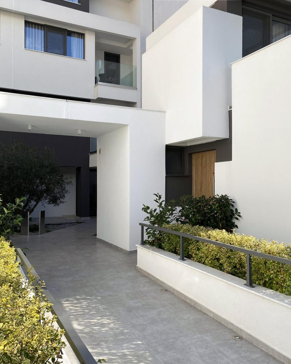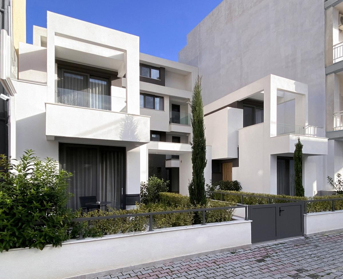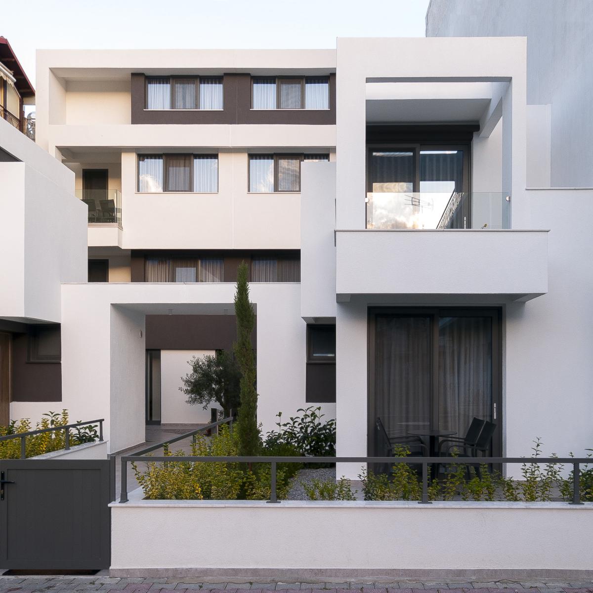 Στην δυτική ήσυχη πλευρά του οικοπέδου που βλέπει σε πεζόδρομο, δύο όμοιες αλλά ανεξάρτητες διώροφες μονοκατοικίες με ιδιωτικό κήπο ενισχύουν την δυναμικότητα του καταλύματος.