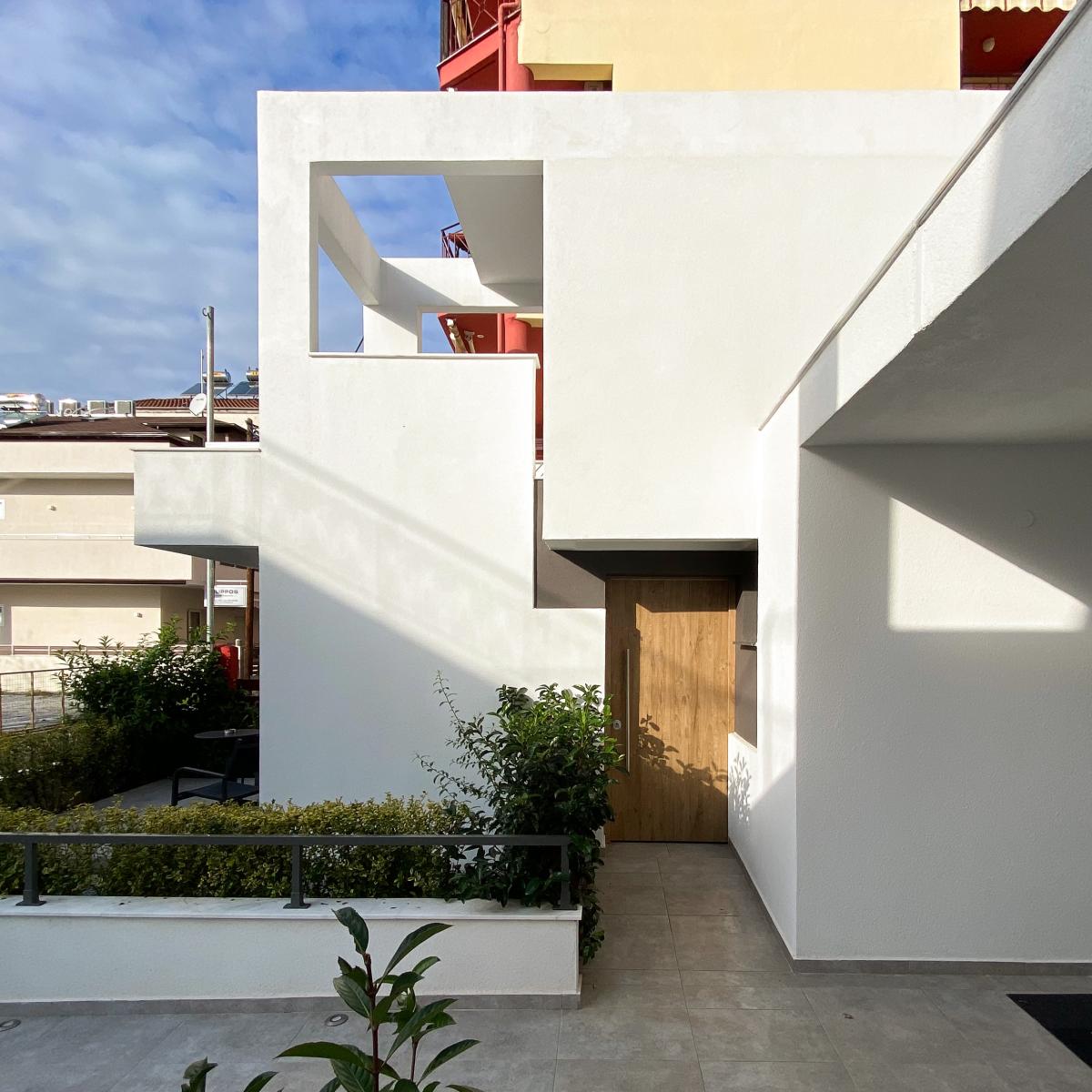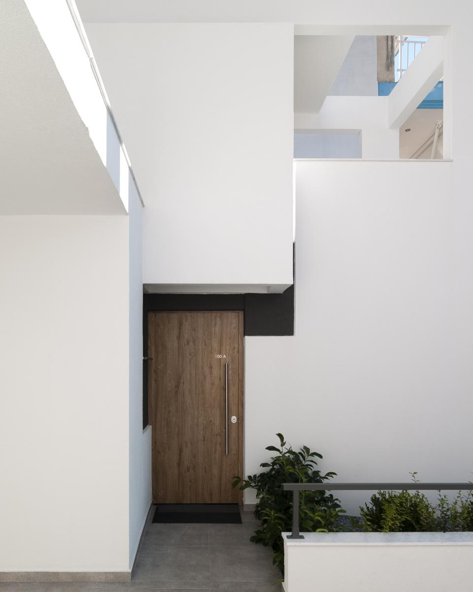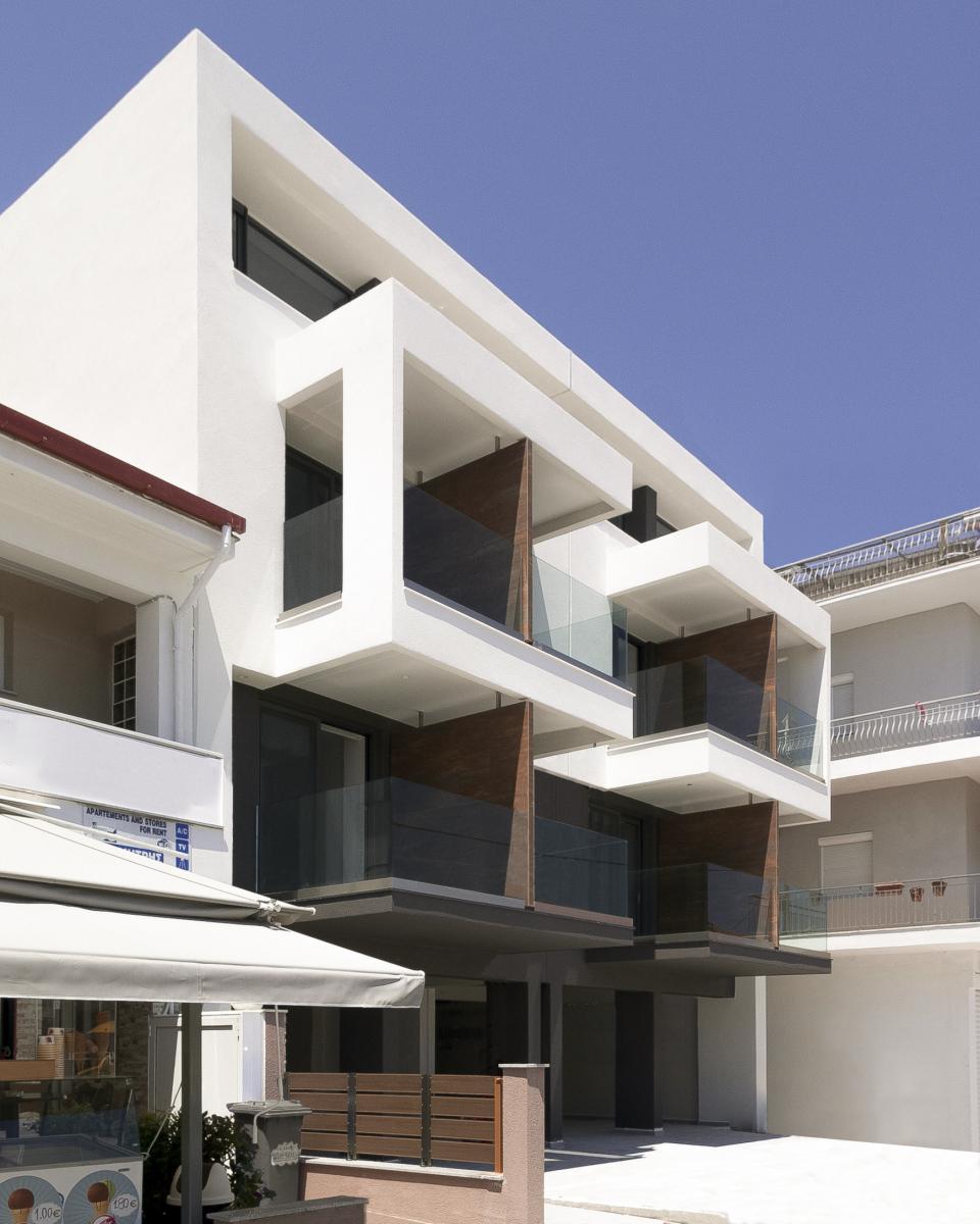 Στην ανατολική πλευρά του οικοπέδου σε επαφή με κεντρικό πολυσύχναστο δρόμο σχεδιάστηκαν δύο όμοια κτίρια διαμερισμάτων με ανεξάρτητες εισόδους και κλιμακοστάσια, των οποίων οι όψεις δίνουν την εντύπωση ενιαίου κτιρίου, καλύπτοντας την απαίτηση των ιδιοκτητών.